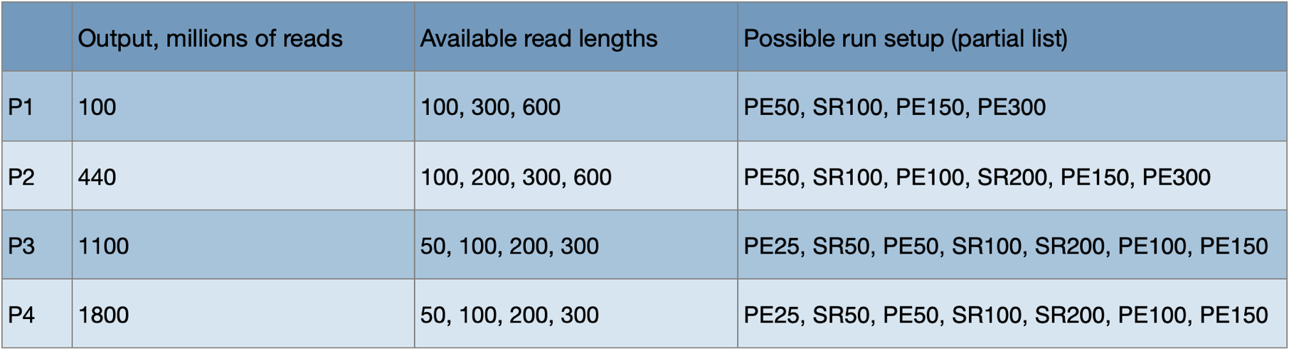 The NextSeq 2000 system can run Illumina’s latest XLEAP chemistry that continues the trend towards lower sequencing costs. Illumina has added different kit options for the NextSeq 2000. At present there are kits of four different outputs (total reads/clusters), designated P1 through P4. There are also different numbers of cycles/bases available. This table lists all options: