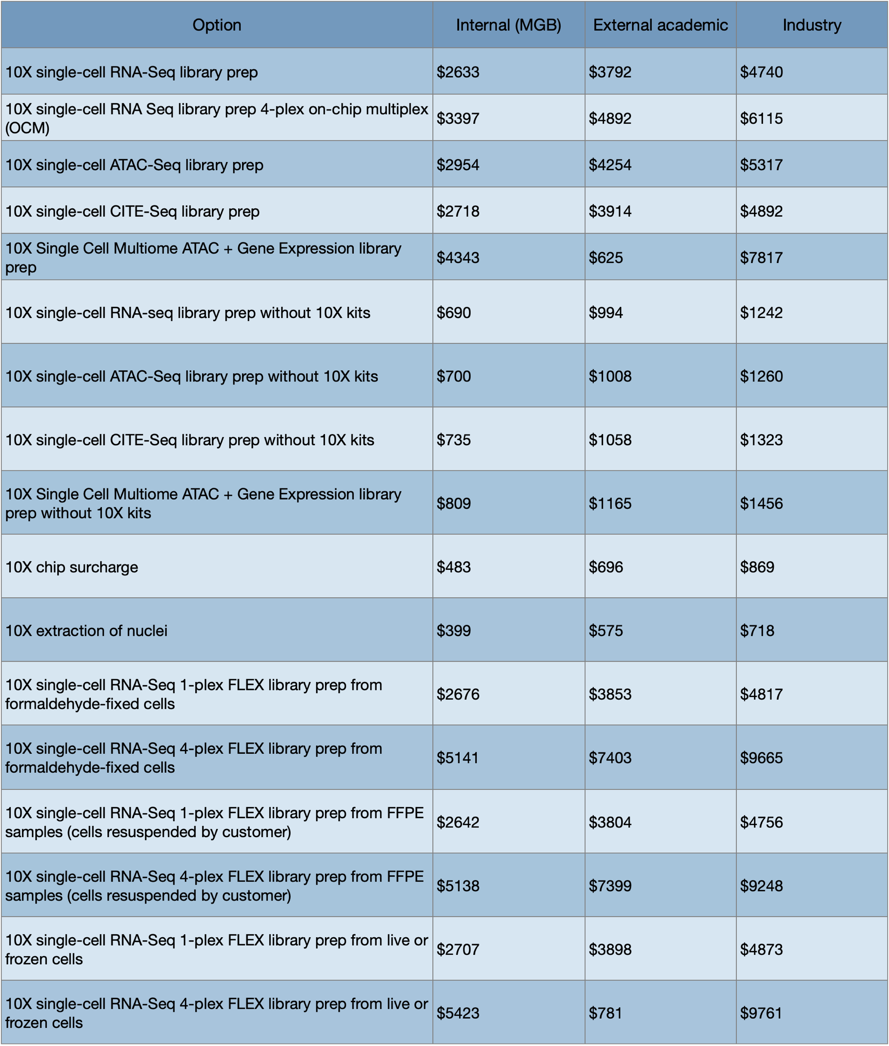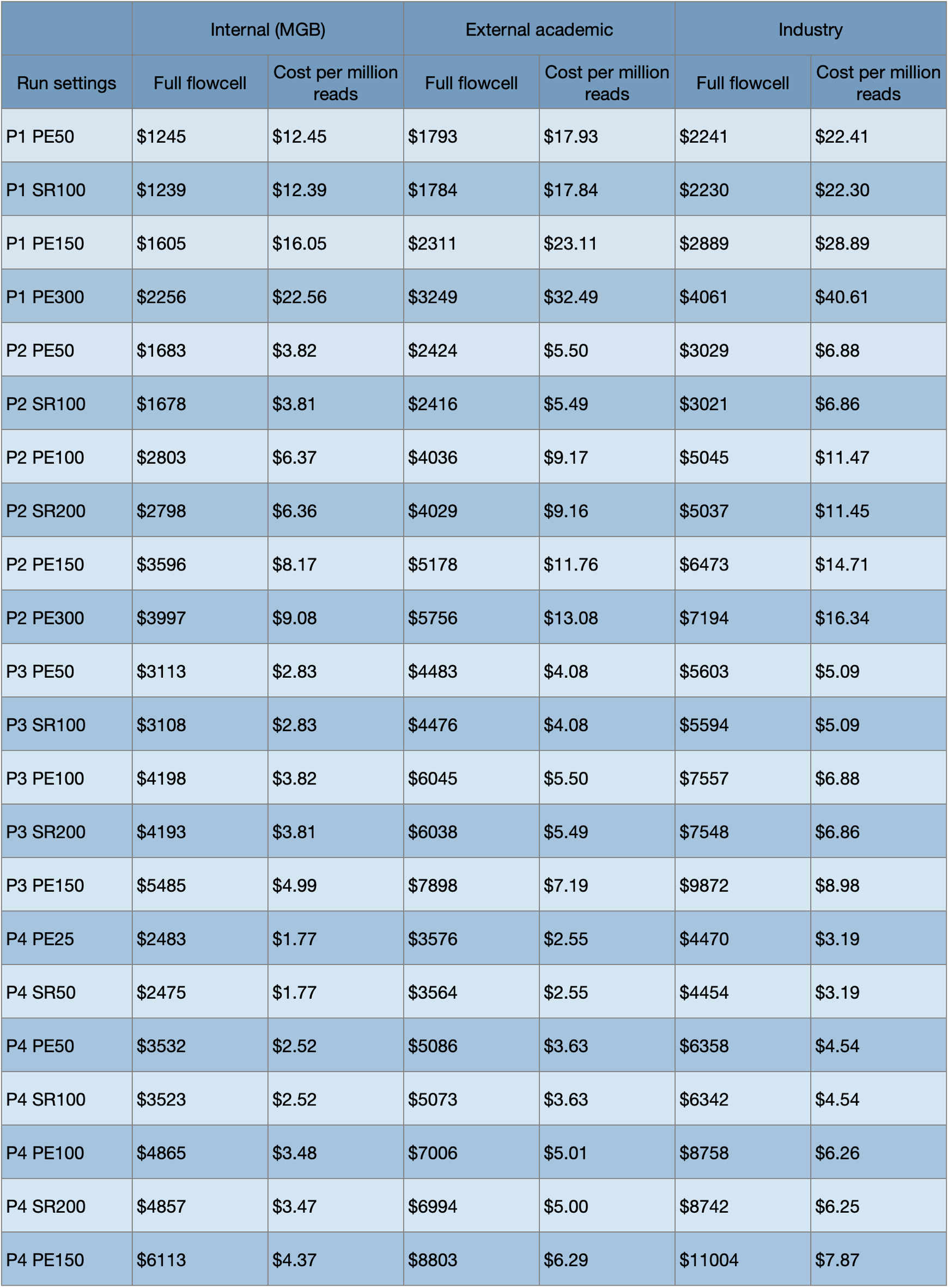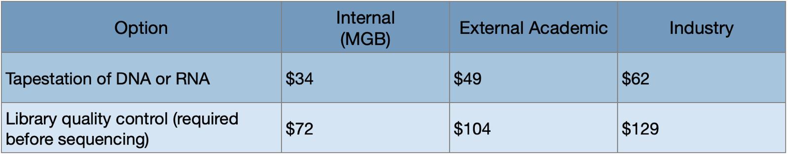 Basic pricing for NextGen library construction and sequencing services is given below. More details on services are on the Information page. Additional fees apply for downstream Bioinformatics analysis services or consultations. Please contact us for additional pricing information or Bioinformatics consulting.